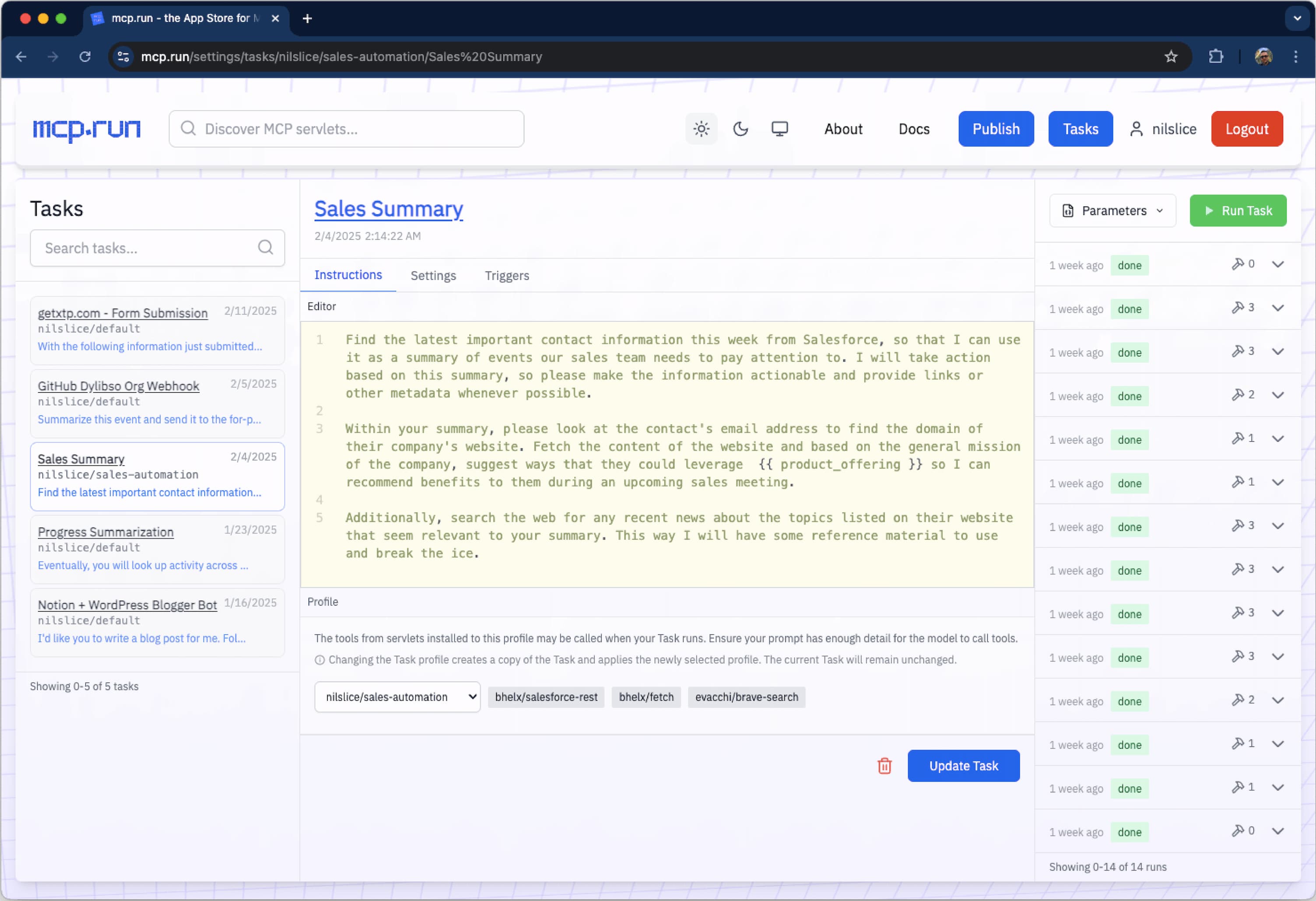 If you want an easy way to use mcp.run tools to automate your work, we recommend looking at Tasks. Tasks are reusable prompts that can be executed here directly or from external applications. Tasks run on our infrastructure. They use the servlets provided in the associated profile.