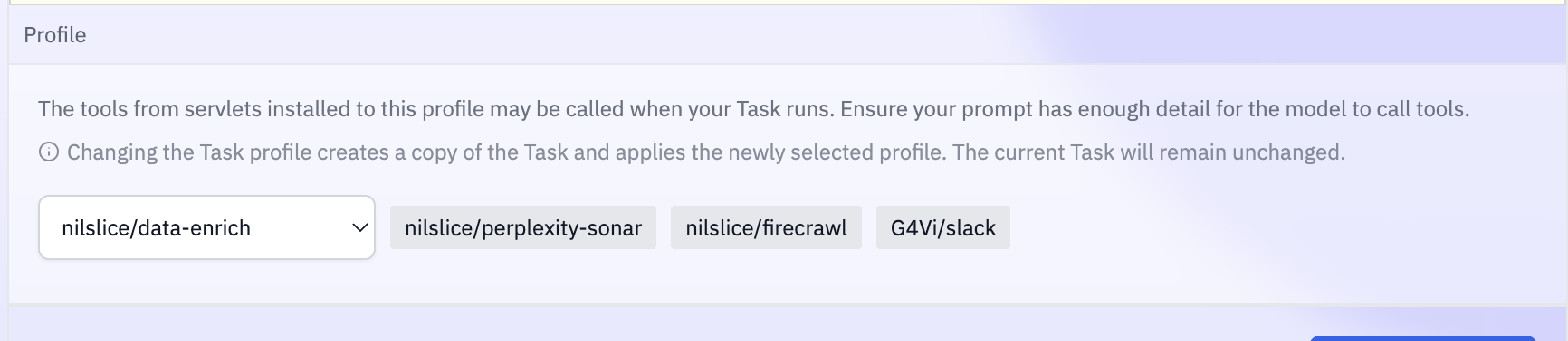 Task to use. Be sure that your selected profile has Perplexity, Slack, and