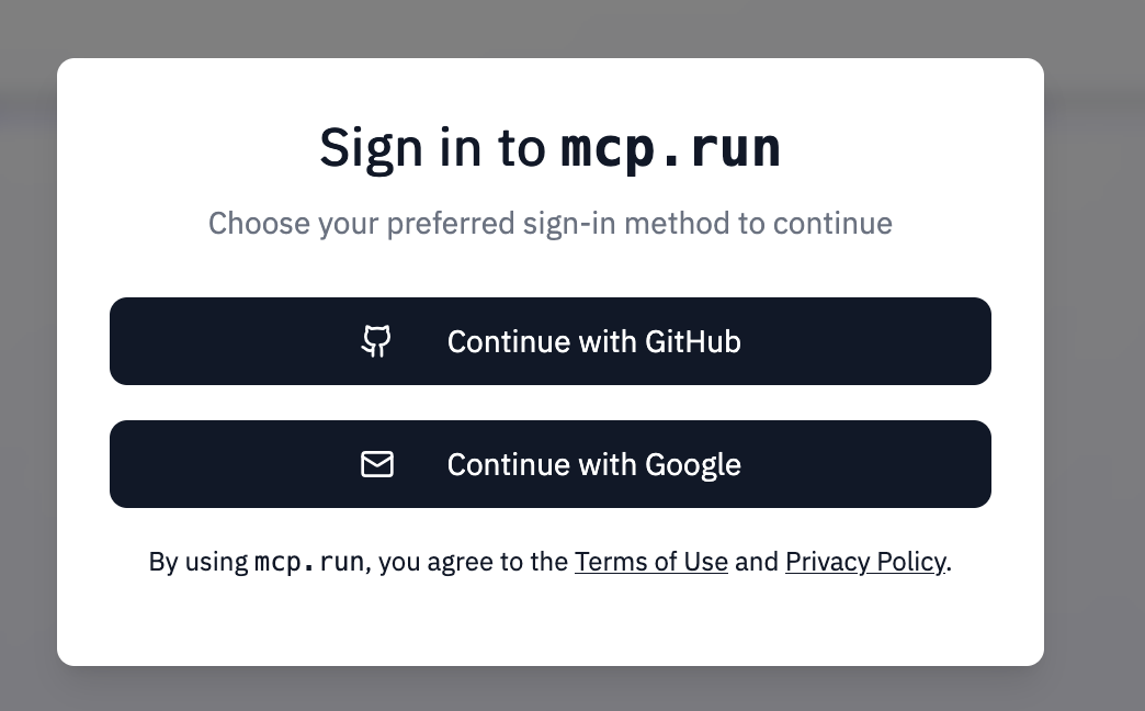 User GuideCreate an AccountOn this pageCreate an AccountHow to start First, head to mcp.run and create your account by choosing a third party service to authenticate with (we currently support GitHub and Google but reach out if you want more).